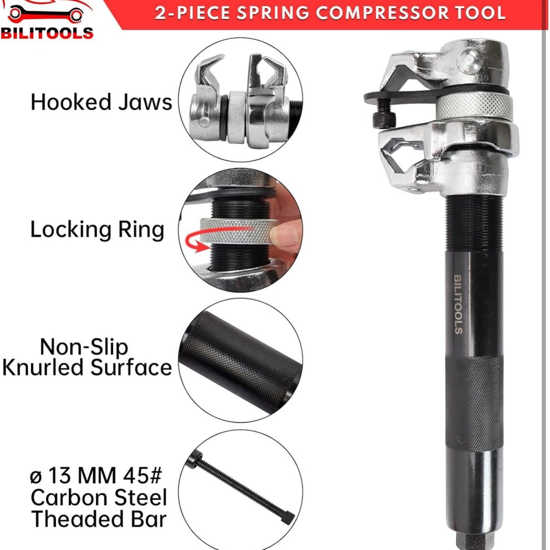 This BILITOOLS Heavy Duty Suspension Coil Spring Compressor with Brace is designed for safe and efficient coil spring removal and installation. Crafted from durable 45# Carbon Steel, it boasts a maximum capacity of 2645 lbs. The tool features hooked jaws and a locking ring for secure attachment, along with a non-slip knurled surface on the handle for enhanced grip. It's compatible with most coil spring compressors, with a jaw capacity ranging from 2.7-10.6 inches and coil diameters from 8.6-12.2 inches. The 19MM hex drive simplifies operation. Excellent, unused condition, perfect for automotive maintenance and repair.
