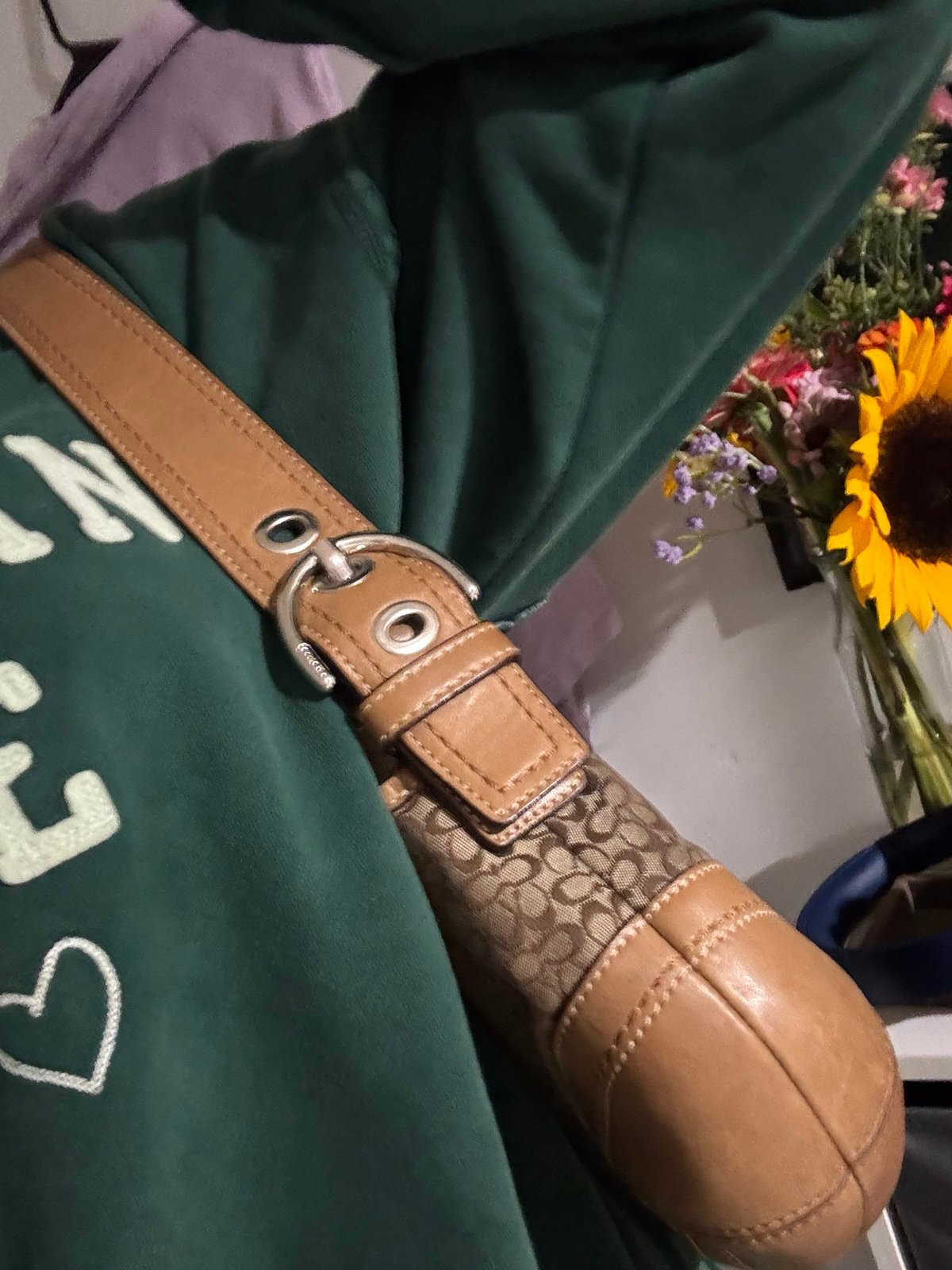signature coach soho jacquard shoulder bag with tan leather trim — coach f10926, circa 2007! extremely spacious! (i could fit three red bulls comfortably with makeup in this!) in mint condition! clean interior, no stains, minimal to no wear!
